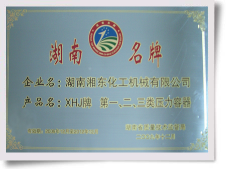 2009年12月,湖南湘東化工機械有限公司的產品名“XHJ牌,第一、二、三類壓力容器”被湖南省質量技術監(jiān)督局授予“湖南名牌”稱號。(王慧卉)